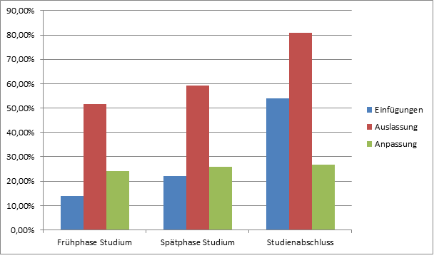 Einfügungen in direkten Zitaten sind nur in 13,8 Prozent der Hausarbeiten in der Studienfrühphase zu finden, während in Studienabschlussarbeiten in 53,8 Prozent der Arbeiten wenigstens einmal ein direktes Zitat mit Einfügung zu finden ist. Ein ähnlicher Anstieg zeigt sich bei der Verwendung von Auslassungen: Hier steigt der Anteil von 51,7 Prozent auf 59 Prozent bzw. 87,8 Prozent. Nur die grammatische Anpassung bewegt sich auf einem nahezu gleichen Niveau.